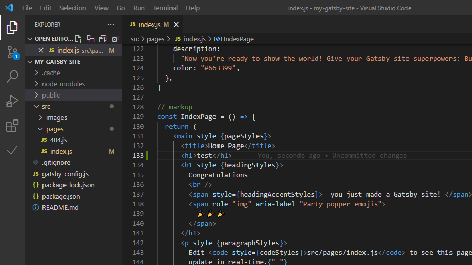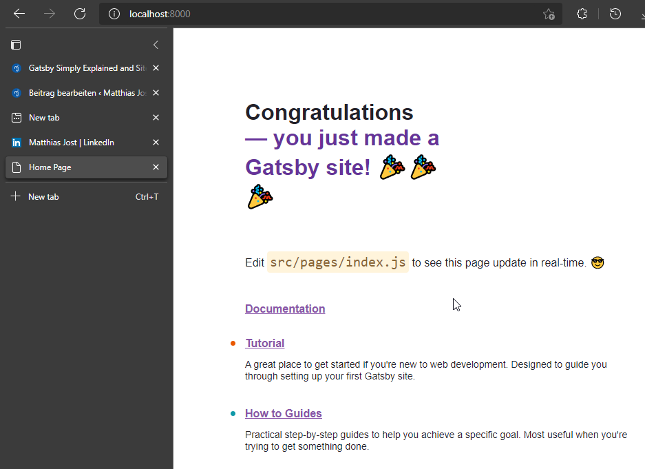 - After you made some changes to the index.js, the Gatsby CLI will automatically update the site. For testing purposes introduce some changes to the text and see if it works.